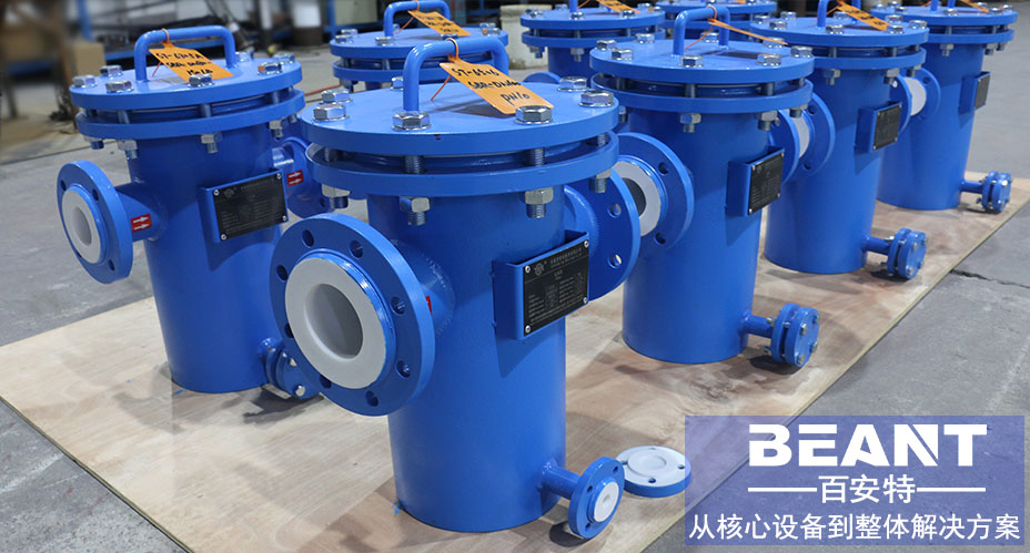 襯氟管道過濾器襯氟管道過濾器主要由接管、筒體、濾籃、法蘭、法蘭蓋及緊固件等組成。安裝在管道上能除去腐蝕性流體中的較大固體雜質,使機器設備(包括壓縮機、泵等)、儀表能正常工作和運轉,達到穩定工藝過程,保障安全生產的作用。 百安特可根據不同的介質及工況條件選用合適的襯里材料及工藝,為客戶提供全面的過濾解決方案。